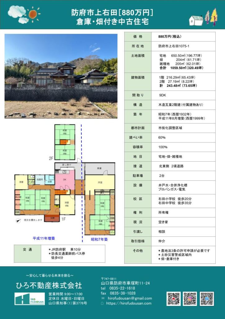 防府市上右田にある中古住宅です***部屋数も多く大きな倉庫と畑もついています(農地法3条の許可申請が必要です)***気になる方は是非一度、現地をご覧ください♡物件概要
