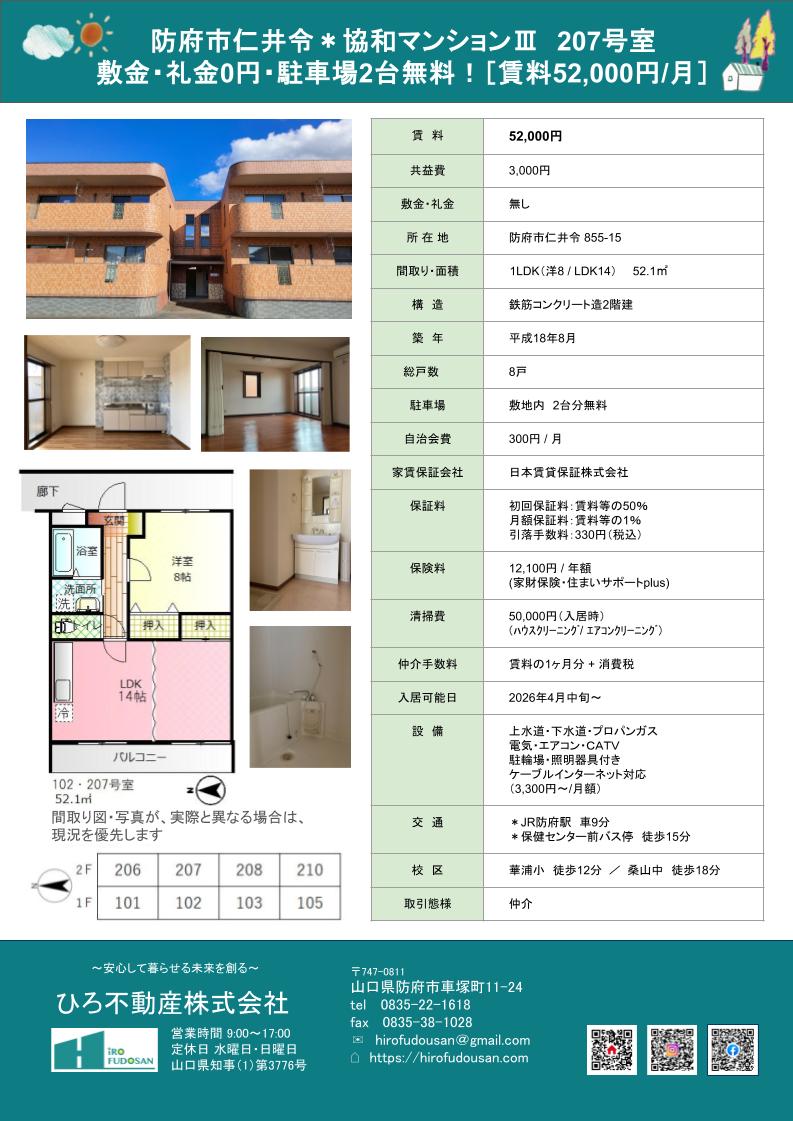 防府市仁井令の静かな住宅街にある賃貸マンションに空き予定あり!4月中旬以降入居可能。駐車場2台分無料。防府駅まで車で9分。コンビニ・スーパー・ドラッグストアなど生活に必要なお店が近くにあります。***敷金・礼金ゼロ!内見は4月初旬以降となりますが、気になる方はお早めにお問合わせください♪