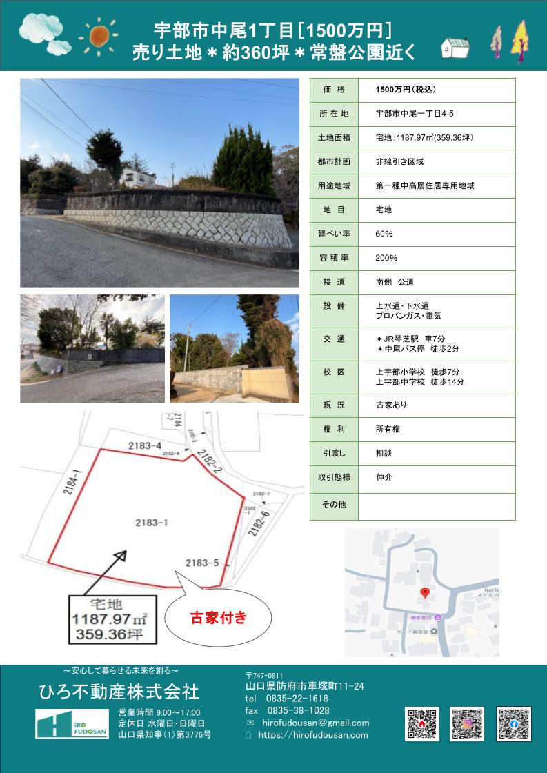 宇部市中尾一丁目にある売り土地です。石垣の上にある少し高台にあり、敷地も広く陽当たりも良好です。***敷地内には古家があります。***詳しくは、お問い合わせください。物件概要