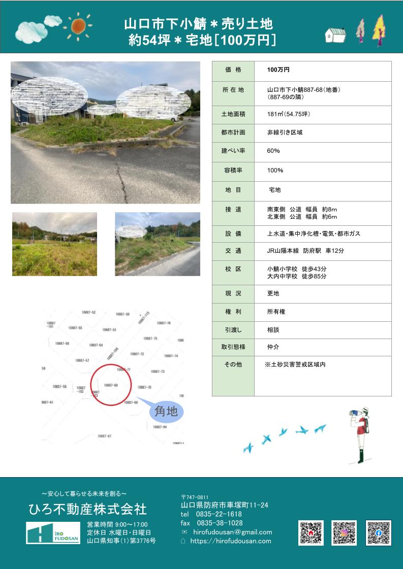 閑静な住宅地。262号線へすぐ出られます。防府駅まで車で12分。バス停は徒歩約4分。道を挟んだ向かいには公園もあります。