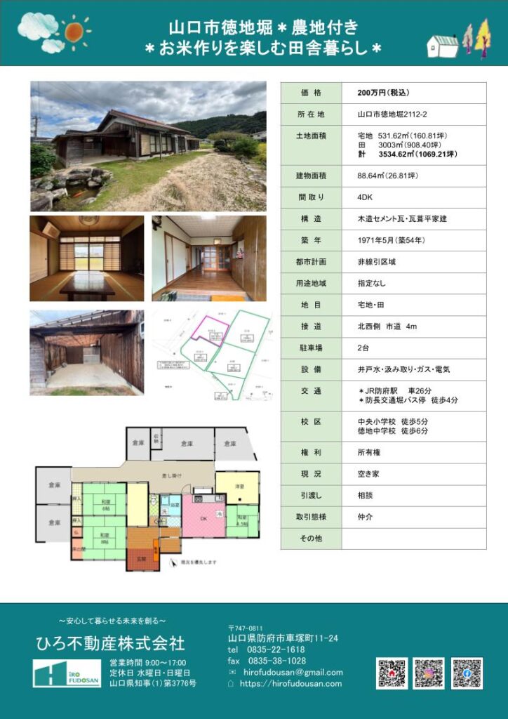 ◇◇商談中になりました◇◇山口市徳地堀にある中古住宅です。田んぼに囲まれて静かでゆったりとした時の流れを感じる環境です。***宅地まわりにある約900坪の田でおいしいお米作りをしませんか?***近くには暮らしに便利な施設、徳地総合支所やコメリ、スーパーもあります!***お米作りをしながらのんびり田舎暮らしを楽しみたい方におすすめの物件です。***お気軽にお問い合わせください♡物件概要